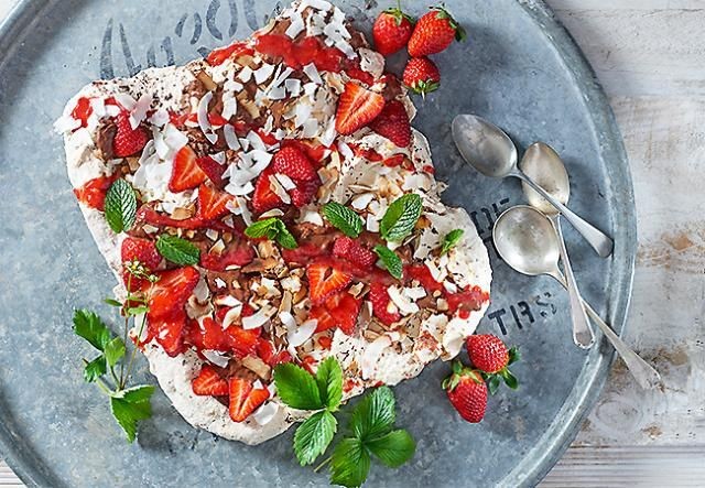 Para servir, echa la mitad de las fresas en un coulis. Sirva la pavlova cubierta con ganache de coco frío, fresas en rodajas adicionales y coco extra.