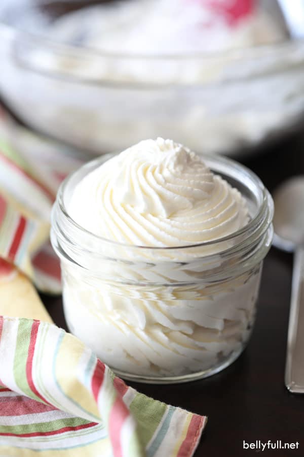 Lo mejor es servir la nata montada casera enseguida, pero a veces es necesario prepararla con antelación. Tú entiendes. Aquí es donde entra la crema batida estabilizada. Se necesita un ingrediente adicional para ayudar a que dure más tiempo en el refrigerador. Mi favorito es el cremor tártaro. porque no afecta el sabor. Por cada taza de crema batida espesa, agregue 1/4 de cucharadita de crémor tártaro junto con el azúcar mientras bate.
