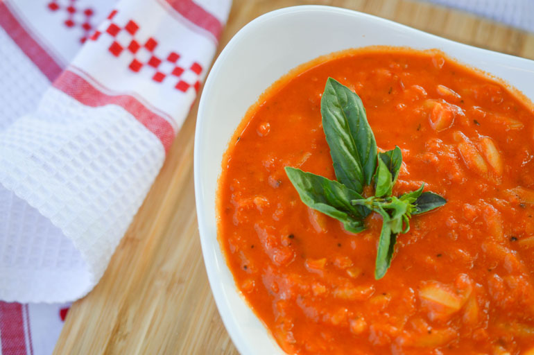 Puedes comprar sopa cremosa de tomate preparada en Costco o en casi cualquier supermercado, pero suele ser muy pesada y sabe a tomate fresco. Me gusta la sopa hecha con tomate extra, albahaca y pimienta. Agregar un poco de cebada cocida lo convierte en un plato principal saludable.