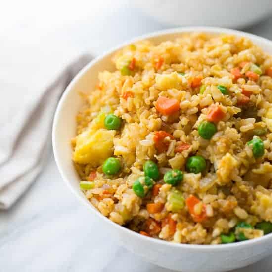 Este arroz frito es una deliciosa sobra, así que siempre hago una gran cantidad y la guardo para el almuerzo durante la semana. ¿Es una comida completa sola o sería genial con otra proteína? Me encanta usar este arroz integral germinado porque el proceso de germinación hace que el arroz sea más fácil de digerir y más rápido de cocinar, ¡pero cualquier arroz servirá!