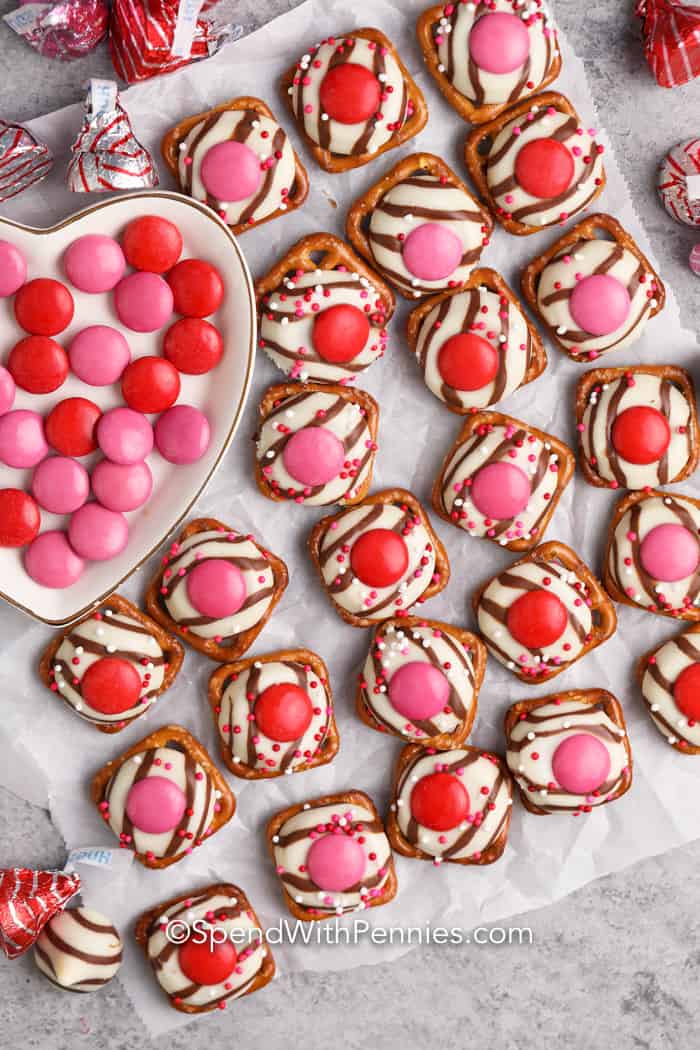 ¡Dale abrazos a todos tus seres queridos en el Día de San Valentín este año! ¿Porque no? Pretzel M&M’s ¡son pequeños pedazos de dulces de chocolate y son tan fáciles de hacer que querrás hacerlos todo el tiempo!