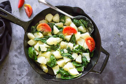 Necesitarás acelgas, papas, ajo y aceite de oliva, y tendrás una deliciosa guarnición vegetariana o plato principal en muy poco tiempo.