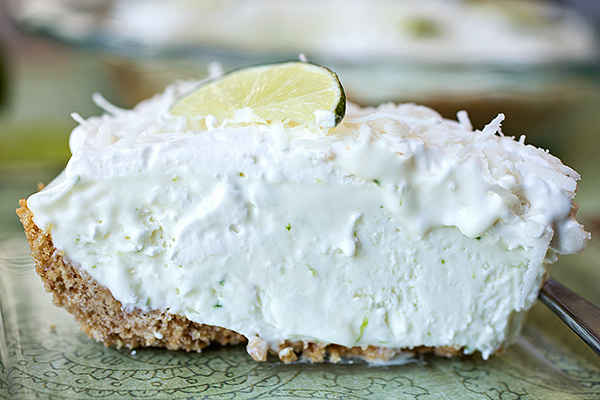 • Masa de galleta Graham (receta a continuación, O use una masa de galleta preparada si lo desea) • 1 taza de crema batida fría • 1 cucharada de azúcar en polvo • 8 onzas de queso crema, ablandado a temperatura ambiente • 1 lata (14 fl oz) de leche condensada • ¼ taza de azúcar granulada • 2 cucharadas de ralladura de limón • ¾ taza de jugo de limón recién exprimido (alrededor de 5 limones) • ¾ cucharadita de saborizante de coco (compré el mío en Whole Foods Market en la sección de extractos) • Crema batida de ron con especias (receta a continuación) • 1 /3 taza de coco rallado endulzado, para decorar • 8 rodajas de limón en forma de semicírculo, para decorar