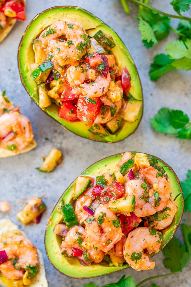 Al igual que su primo el ceviche de camarones, estos aguacates rellenos tienen mucha flexibilidad en lo que respecta a los ingredientes.