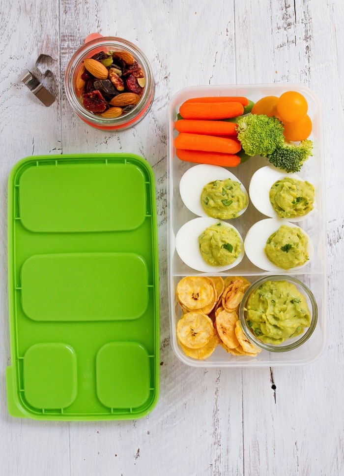 Los huevos rellenos se rellenan con una combinación de yema de huevo hervida, aguacate, jugo de limón, ajo, sal, pimienta y cilantro. ¡Así que es casi como si los estuvieras llenando de guacamole! Para jugar con este concepto, puse el relleno extra en un tazón pequeño y preparé el almuerzo con verduras y chips de plátano para mojar.