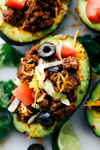 Aguacate relleno de tacoSe cocina una sabrosa carne molida rellena de aguacate maduro cargada de tomate picado, aceitunas en rodajas, lechuga desmenuzada y queso espolvoreado. UNA¡giro saludable en los tacos!