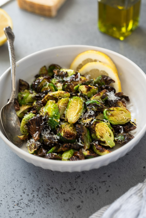 Las freidoras de coles de Bruselas son increíblemente crujientes, hechas con un mínimo de aceite y mezcladas con limón y queso parmesano. ¡Son un refrigerio saludable o una guarnición que está lista en unos 20 minutos!