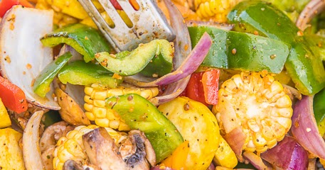 Verduras asadas con ajo asado: excelente como guarnición o pasta. ¡Qué FÁCIL seguimiento! Pimientos, cebollas, champiñones, maíz y calabaza mezclados con aceite de oliva, azúcar morena, paprika, chile en polvo, sal, pimienta y ajo. ¡Listo para comer en unos 15 minutos! #asar a la parrilla #verduras #guarnición #fácil #comidasaludable #bajoencarbohidratos