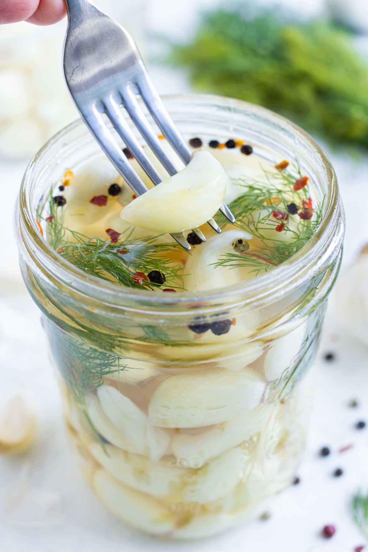 ajo en escabeche es una receta rápida y fácil que simplemente combina los clavos de olor con una solución casera de salmuera en el refrigerador durante la noche. La mejor manera de hacerlo es con eneldo fresco y especias en escabeche, si lo desea. ¡Estos bocadillos agridulces son deliciosos en muchos platos o incluso se comen solos!