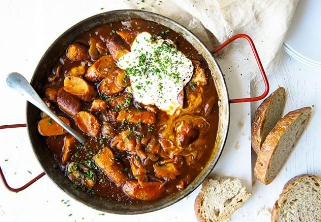 Otra forma de preparar este platillo es poner todos los ingredientes excepto la crema agria y el cebollín en una olla grande y cocinar en horno moderado por 30-40 minutos. Mezclar con crema agria y cebollino antes de servir.