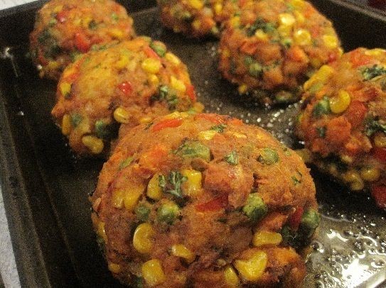Mezclar bien y luego agregar los garbanzos. Con las manos mojadas, forma bolitas grandes con la mezcla y colócalas en bandejas para hornear engrasadas.