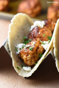 Divide las albóndigas entre las tortillas de maíz y espolvoréalas con queso Cotija y cilantro.