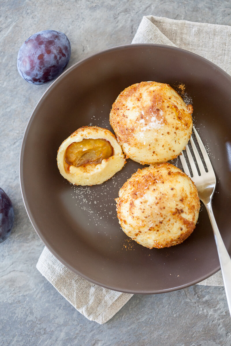 - Extender la masa sobre una superficie enharinada de aproximadamente 0,5 cm de espesor. Cortar la masa en cuadrados de unos 7 cm. También puedes cortar en círculos. En el centro, coloca una ciruela sin hueso, espolvorea con una cucharadita de azúcar y canela, agrega un poco de mantequilla y dobla la masa sobre la fruta. Forme albóndigas y asegúrese de presionar la masa firmemente hasta el fondo.
