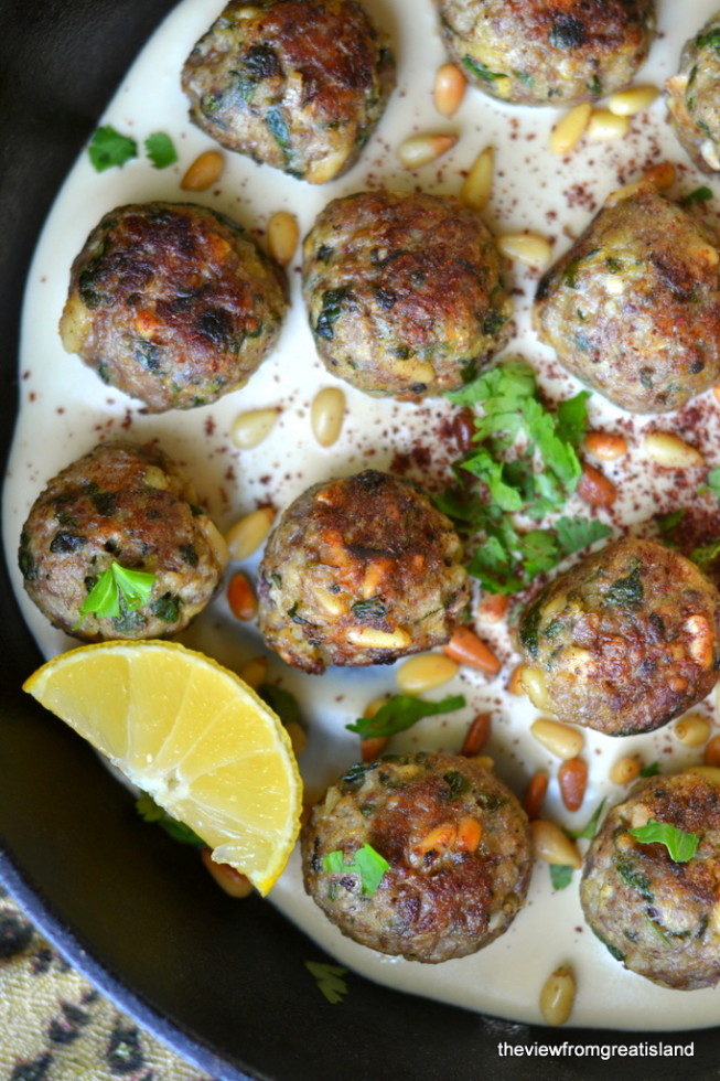 Sirva las albóndigas recién salidas del horno, bañadas en la salsa. Adorne con más piñones, hierbas y una pizca de zumaque o paprika.