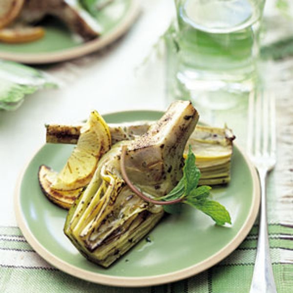 - Preparar la barbacoa (fuego medio-alto). Batir el aceite, 1/3 taza de jugo de lim贸n y menta en un taz贸n peque帽o. Sazone el condimento al gusto con sal y pimienta. Pintar las alcachofas con la salsa. Ase a la parrilla hasta que est茅n tiernos y ligeramente carbonizados, volte谩ndolos de vez en cuando, unos 8 minutos. Transfiera las alcachofas a la fuente. Roc铆e con cualquier condimento restante. Servir caliente oa temperatura ambiente.