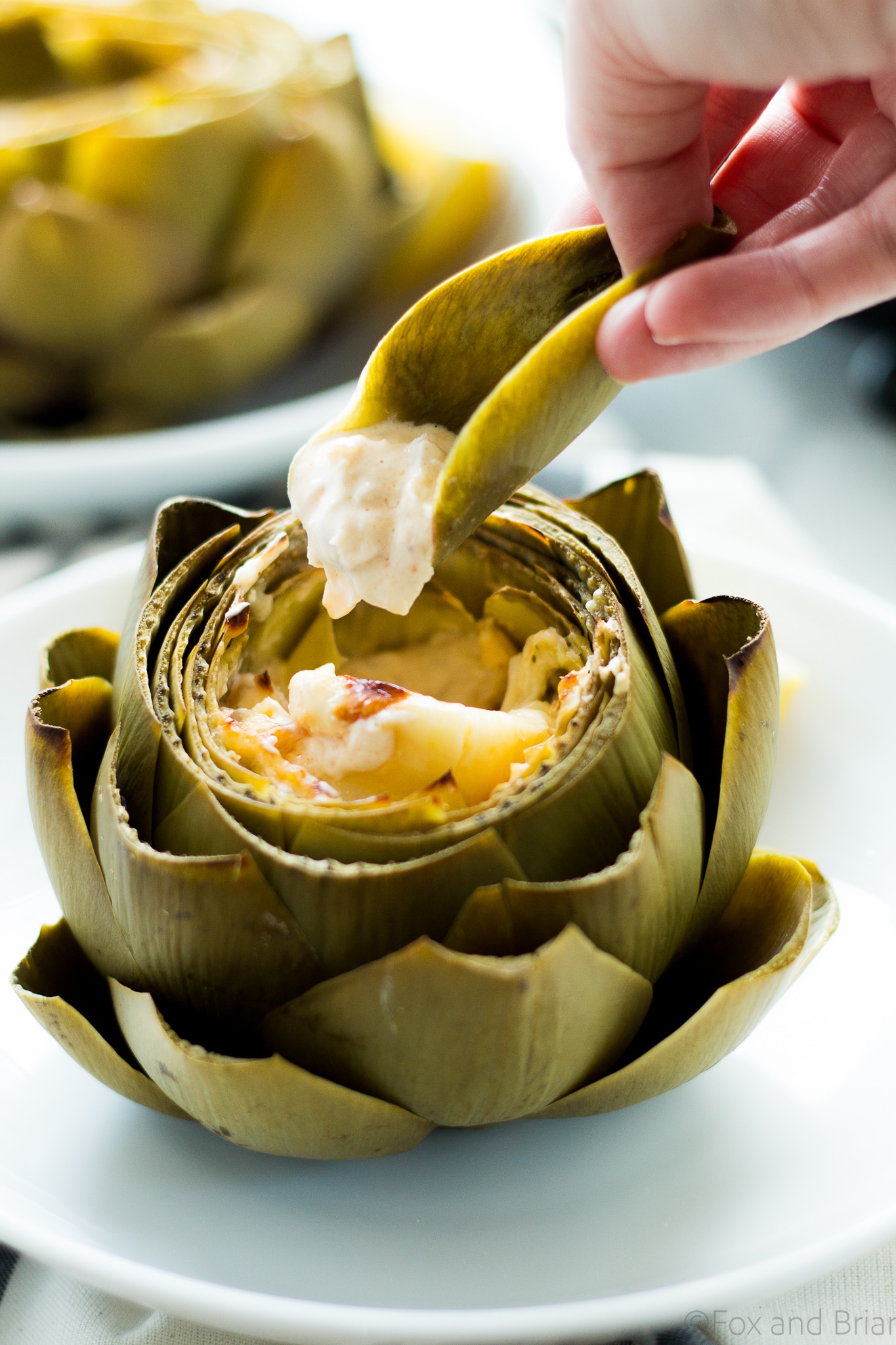 Una cosa que me encanta de los blogs de comida es que me expande creativamente. A veces las ideas fluyen, pero otras veces parecen estar fuera de mi alcance, y necesito pensar en nuevas ideas. Cuando Fred Meyer me pidió que creara una receta de alcachofas rellenas para su libro electrónico de Pascua (puedes encontrarlo gratis AQUÍ), tuve que pensar un poco. ¿Qué sería genial relleno de una alcachofa? Me tomó algo de tiempo y algunas ideas menos antes de recordar la salsa picante de cangrejo y alcachofa. Pero ¿y si en lugar de poner la alcachofa en la salsa, ponemos la salsa en la alcachofa? Hmmmmm. Lo que me encanta de esta receta es que la alcachofa sirve como plato comestible, y mientras comes, ¡puedes mojar cada pétalo de alcachofa en la salsa! Es divertido comer y servir.