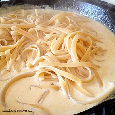 Escurre la pasta y agrégala a la salsa Alfredo. Agregue el pollo y revuelva para cubrir.