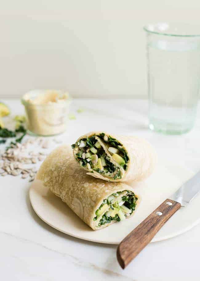 Dale un empujón a tu tarde con este delicioso wrap rico en proteínas elaborado con hummus, kale, aguacate, pepino, cebollín y semillas de girasol.