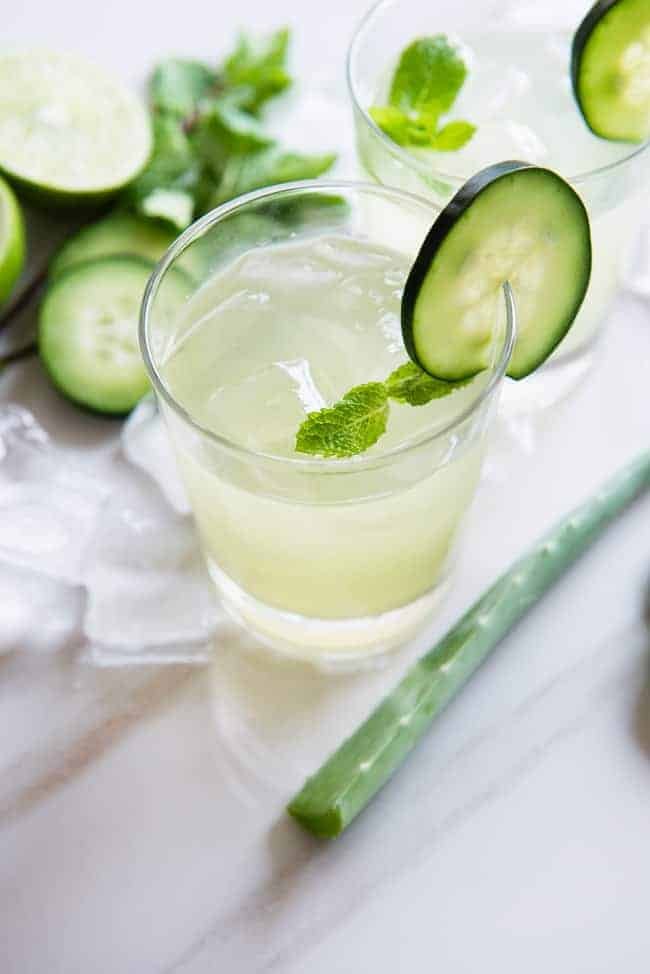 Combine las rodajas de pepino, las hojas de menta, el jugo de limón y el azúcar en una coctelera y triture con una mano o una cuchara. Agregue el vodka y el jugo de aloe vera y complete con hielo.