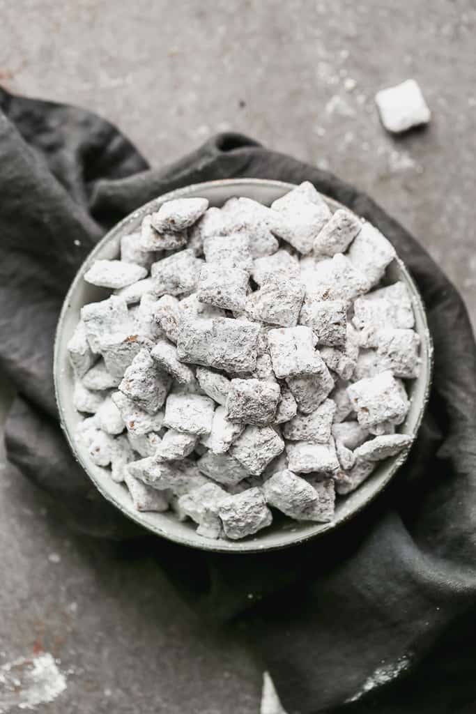 No puedo pensar en un bocadillo de fiesta más popular que amigos fangosos (Puppy Chow), hecho con cereal Chex cubierto de chocolate, mantequilla de maní y azúcar en polvo.