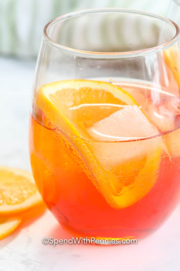 El Aperol Spritz se sirve mejor en vasos jumbo de tallo largo para contener muchos cubitos de hielo. Esta bebida gaseosa es especialmente buena en vasos de burbujas. O bien, puede servirlo en vasos altos en caso de necesidad. Agregue una rebanada de órgano para decorar.