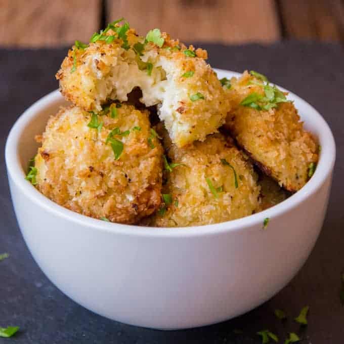 ¡La maravilla de la planta de coliflor ataca de nuevo! ¿La utilidad de esta verdura normalmente insípida y ligeramente maloliente no tiene fin? Estos pequeños arancini de coliflor rellenos de cremoso boursin y cubiertos con pan rallado crujiente. ¡SÍ, POR FAVOR!
