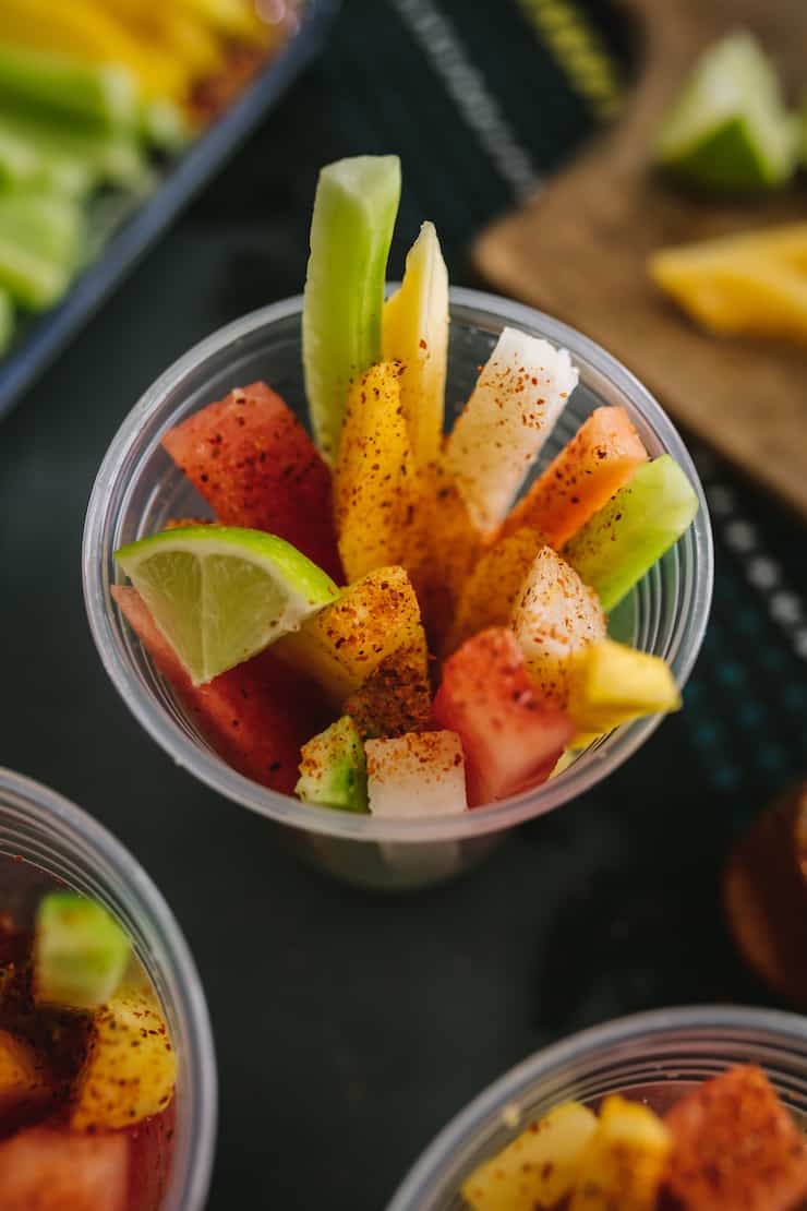 Lleve la fruta mexicana directamente a su cocina con tazas de frutas mexicanas rociadas con jugo de limón fresco y espolvoreadas con Tajin.