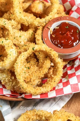 - Para hornear: Coloque los anillos en una sola capa en una bandeja para hornear forrada de pergamino. Cocine, volteando a la mitad, hasta que estén dorados y crujientes.