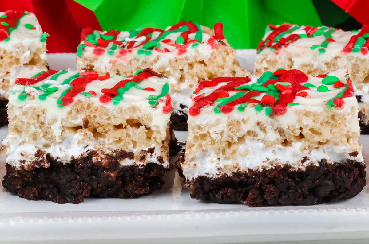 A su familia le encantarán estas fiestas navideñas con Brownie Rice Krispie Treats con Brownies y Rice Krispie Treats.
