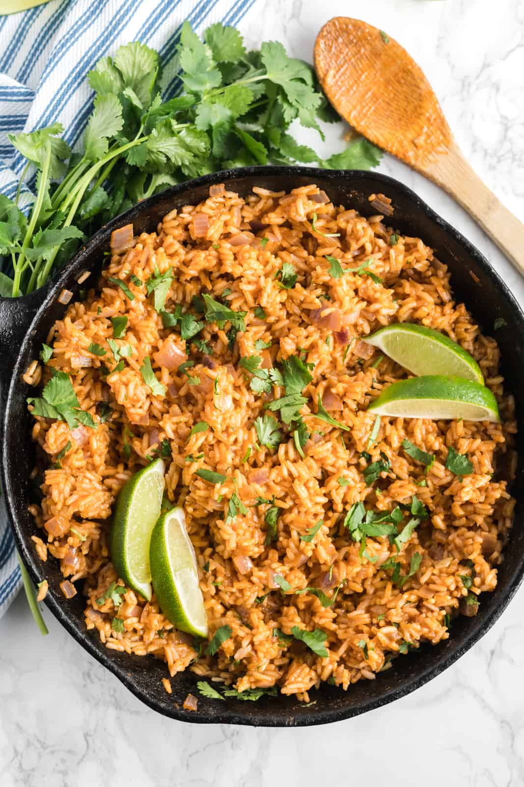 Hay tantos platos que servimos regularmente junto con este sencillo arroz español. aplasta, quesadillas de pollo, Enchiladas de pollo con pimientos verdes ¡y muchos otros!