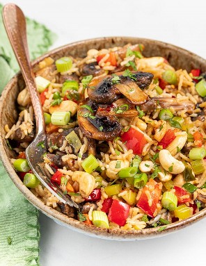 Esta receta de arroz frito con champiñones es económica y súper rápida de hacer. Es una excelente manera de usar el arroz cocido sobrante, ¡todo se hace en una olla y no toma más de 15 minutos! Plato: Entrante, Plato Principal Tipo de Cocina: Vegano Tiempo de Preparación: 10 minutos Tiempo de Cocción: 10 minutos Tiempo Total: 20 minutos Raciones: 4 Raciones Calorías: 332kcal