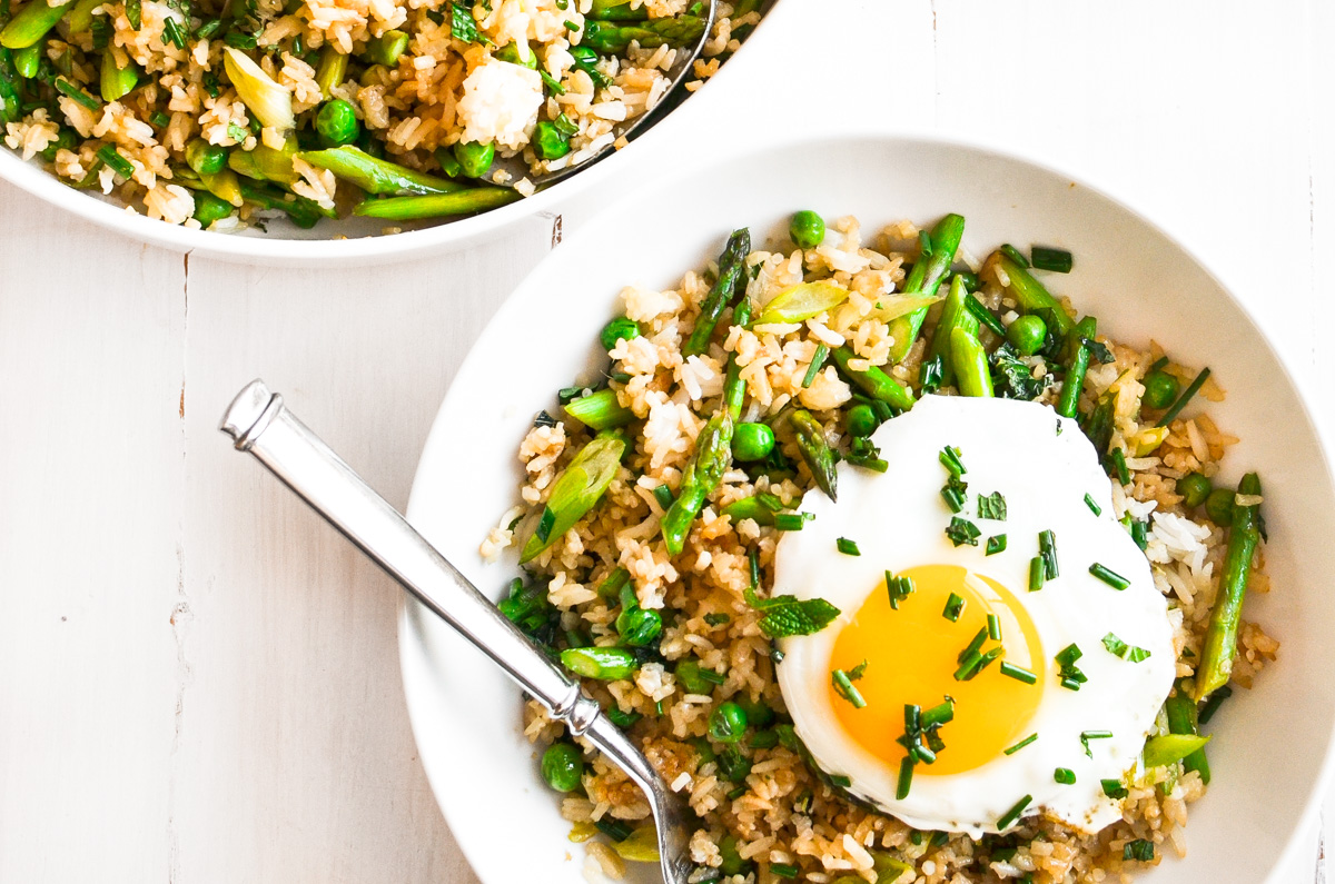 Arroz frito con espárragos y guisantes ~ una cena primaveral vegetariana que es perfecta sola o ~ ¿tienes que preguntar? ~ ¡Ponle un huevo!