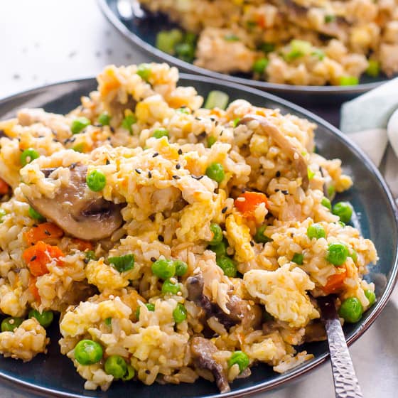 Arroz frito instantáneo con arroz integral y pollo para una cena saludable y fácil.