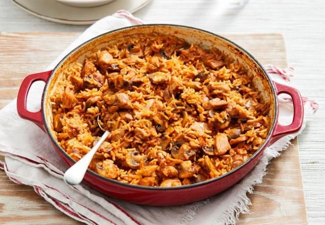 Agregue arroz y caldo de pollo Campbell’s real. Llévalo al fuego. Hornee, tapado, durante 15-20 minutos hasta que el arroz esté bien cocido. Dejar reposar durante 5 minutos.