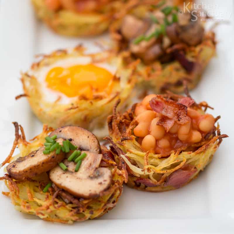 - Después de que la papa descanse de 20 a 25 minutos, puede agregar el huevo.Para las papas fritas pequeñas:* Casca un huevo en un plato pequeño. Vierta con cuidado la yema en una de las copas de hashbrown, luego vierta algunas claras de huevo. No quieres que inunde tus tazas con papas fritas, por lo que es poco probable que necesites todas las claras de huevo. Repita con los otros dos huevos.Para el Hashbrown grande:* Presione ligeramente los anillos de huevo sobre la patata y rompa los huevos en los anillos de huevo