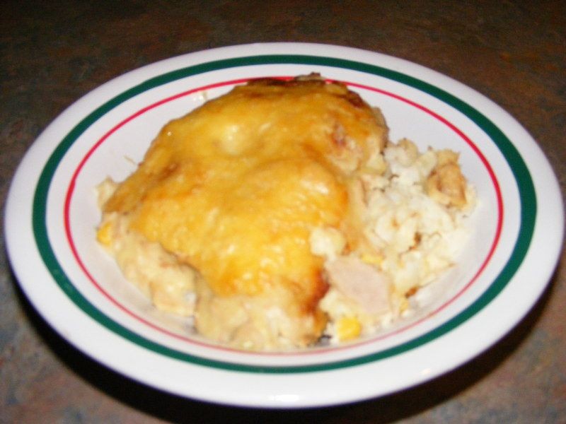 Agregue la cebolla y el apio al arroz con los granos de elote, la piña picada, el queso y los huevos batidos.