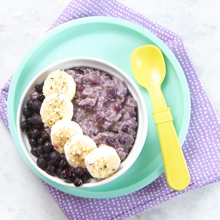 ¡Incluso mi pequeño, que no se convence fácilmente de que la avena debería ser un grupo de alimentos, se siente atraído por esta papilla de desayuno debido a su divertido color púrpura!