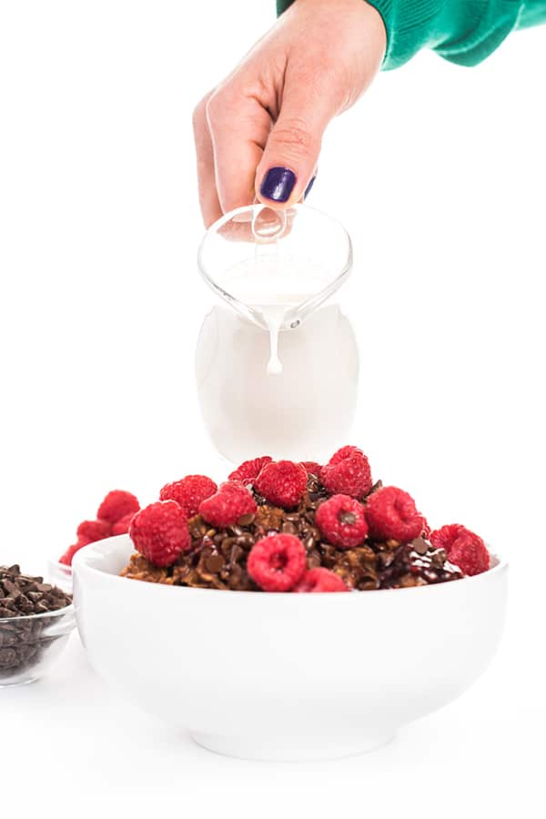 La avena a la antigua se cocina en una mezcla de leche entera, linaza, cacao en polvo, canela y vainilla antes de cubrirla con mermelada de frambuesa pura.