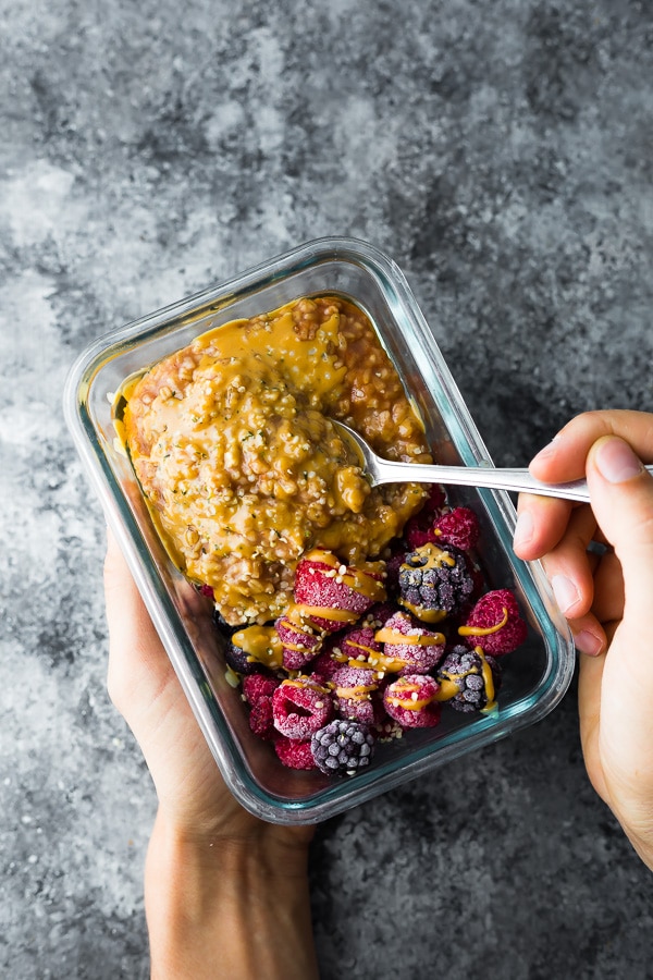 Para recalentar, caliente en el microondas hasta que esté muy caliente. Agregue un poco de leche de almendras o leche y revuelva para “aflojar” la avena. Cubra con almíbar, bayas, mantequillas de nueces o sus ingredientes favoritos.