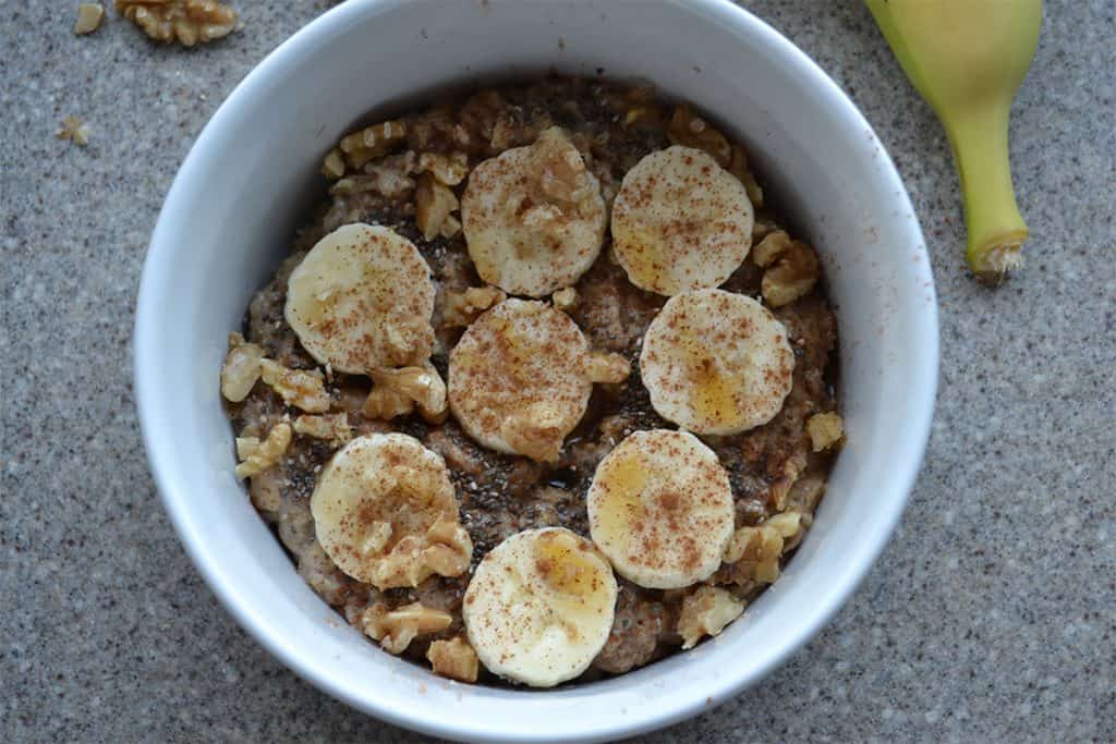 Todavía tengo que conocer a un niño al que no le guste el pan de plátano. La combinación de avena con sabores de pan de plátano seguramente entusiasmará a cualquier niño para el desayuno. Esta deliciosa y sencilla idea para el desayuno sigue algunas de mis reglas básicas de nutrición para el desayuno. Combina proteínas y grasas de alta calidad con cereales para mantenerte satisfecho durante más tiempo. Las nueces y semillas de chía son una excelente opción para el desayuno debido a su bajo índice glucémico. Esto evitará que su nivel de azúcar en la sangre se dispare por la mañana, lo que suele ser el caso con la mayoría de las opciones de desayuno. También es bajo en azúcar. El único edulcorante que necesitas aquí es una pizca de jarabe de arce y plátanos picados. No se necesita azúcar residual. En mi avena a veces la cocino con un poco de leche para darle un sabor más cremoso a mis bebés, pero el agua es perfectamente perfecta en esta receta.
