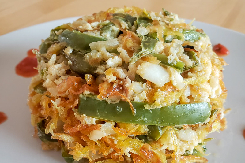 Una de las creaciones favoritas de mi suegra es este reconfortante plato elaborado con bacalao (bacalao), huevos, patatas, cebollas y pimientos. Antonia lo prepara rápido y lo sirve espolvoreado con tomate frito casero.