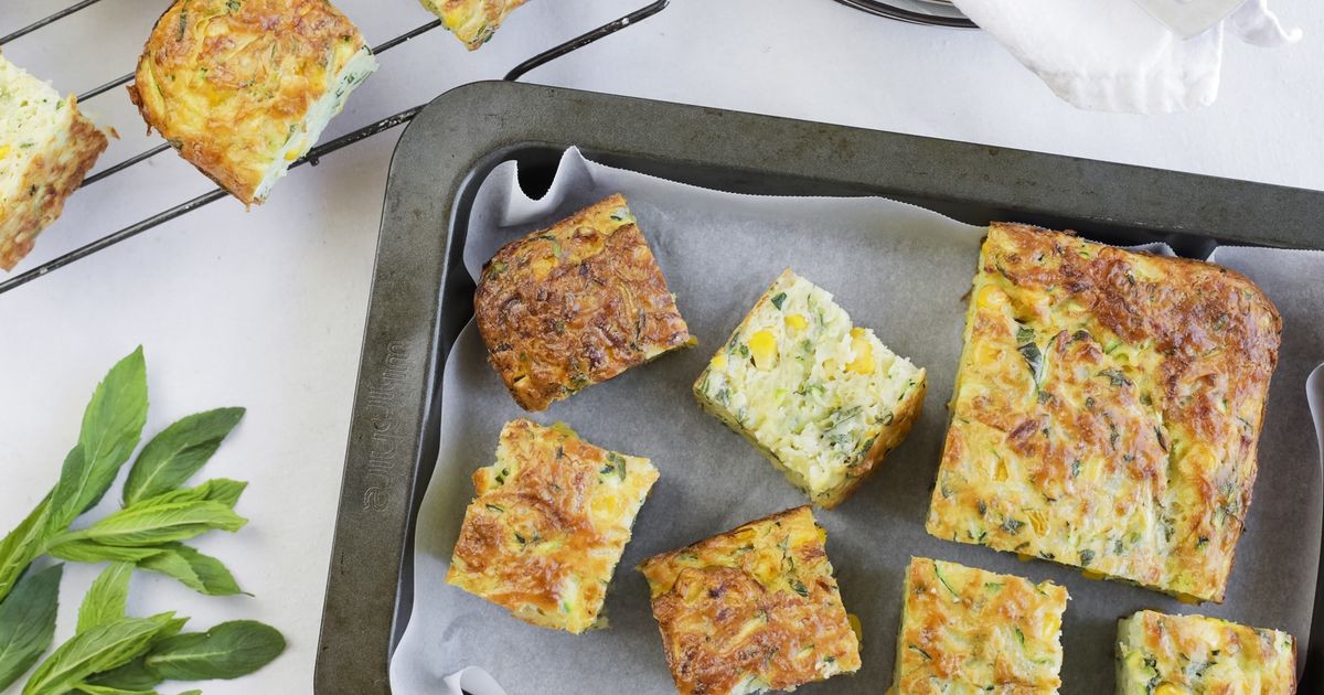 En un tazón grande, bata los huevos. Mezclar la mezcla de menta, haloumi, calabacín, maíz y cebolla cocida. Sazone bien con sal y pimienta. Dobla la harina.