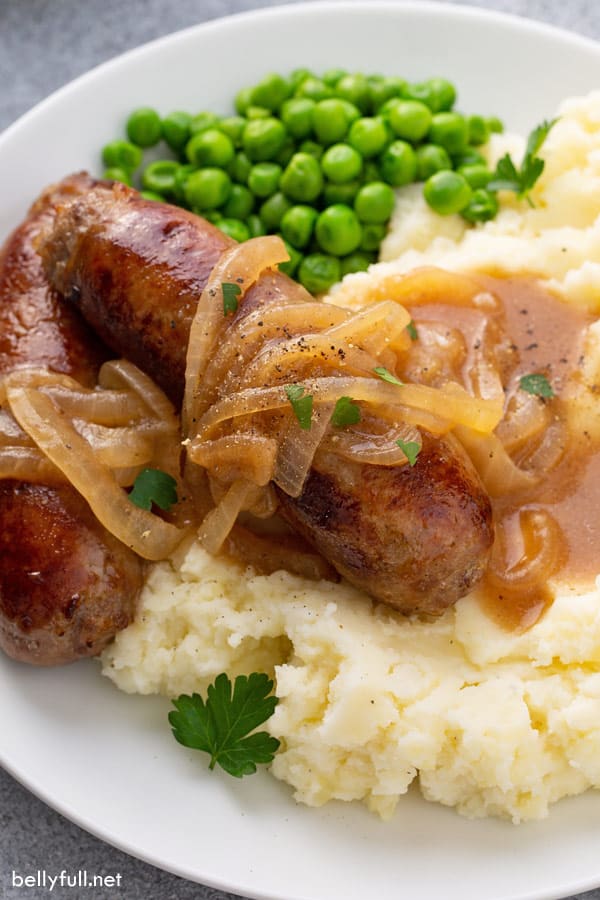 Los bangers son salchichas y Mash se refiere al puré de patatas. El nombre surgió durante la Primera Guerra Mundial cuando había escasez de carne, por lo que las salchichas se hacían con demasiada agua o pan seco, lo que hacía que explotaran (¡con un estruendo!) durante la cocción. Bangers and Mash es un plato de pub muy popular en Irlanda y el Reino Unido, ¡pero es muy fácil recrearlo en casa!