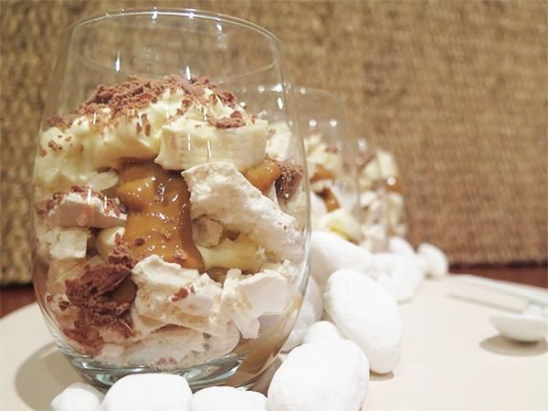Atender: Rompa los merengues y coloque algunos pedazos en vasos para servir. Vierta un poco de caramelo Top ‘n’ Fill, luego agregue unas rodajas de plátano y luego la crema batida. Cubrir dos veces más, terminando con la crema. Decorar con hojuelas desmenuzadas.