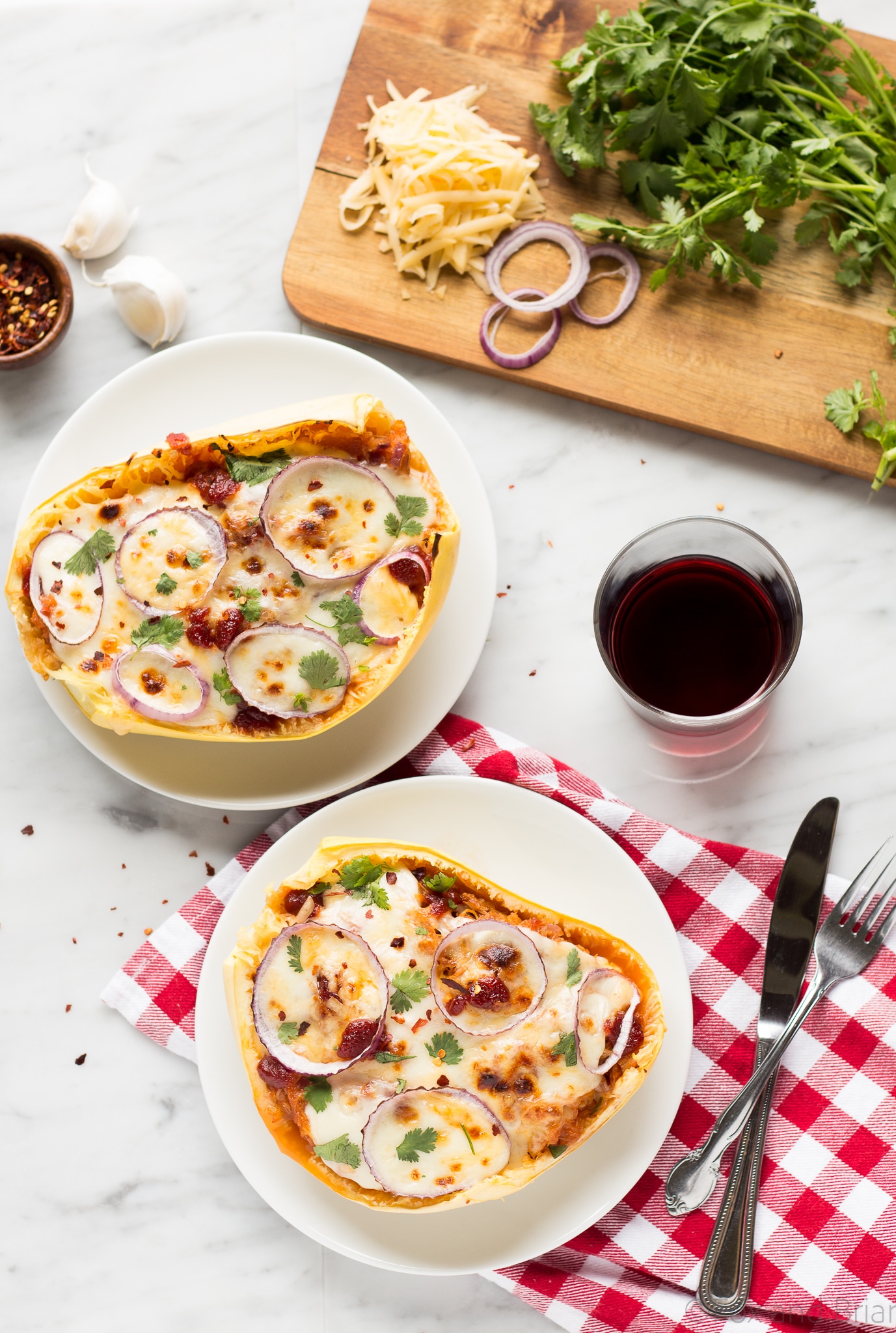 De todos modos, como me encanta esta pizza pero siempre buscando formas de reemplazar los carbohidratos con vegetales, inventé la BBQ Chicken Pizza SPAGHETTI SQUASH BOAT. Derecha. Yo fui allí.