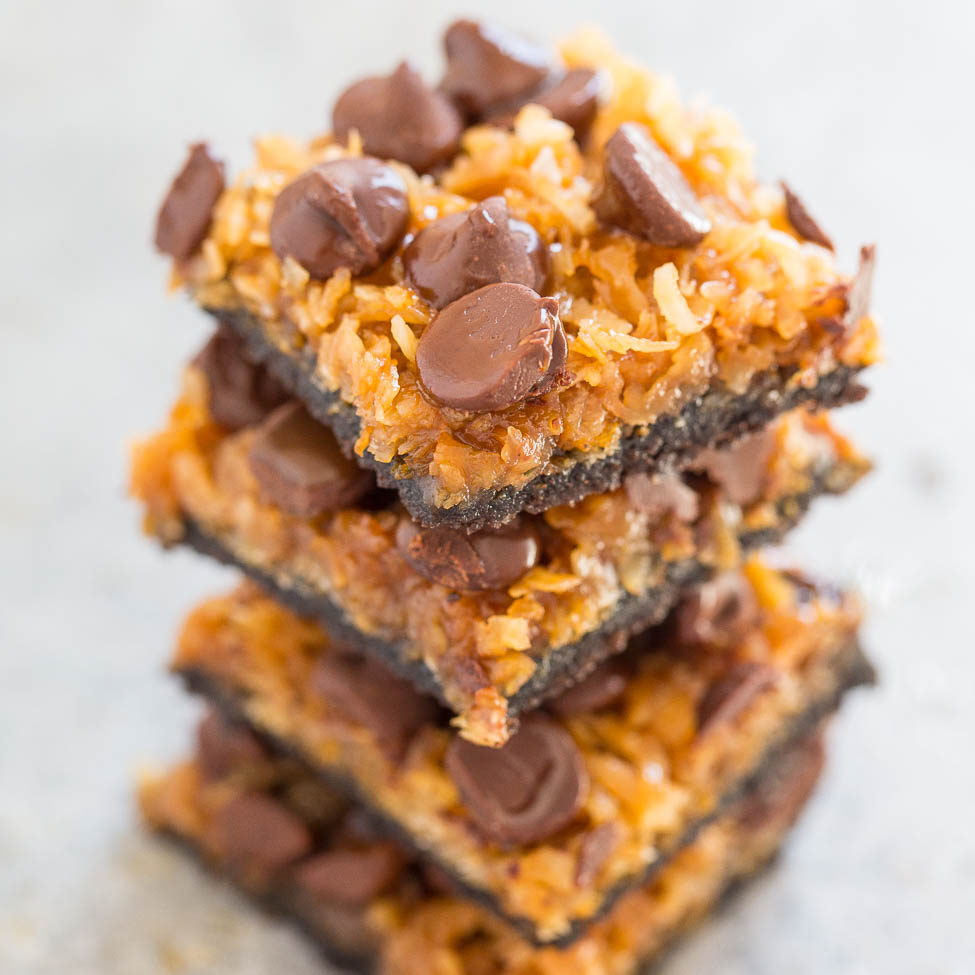 Barras Better Than-Scout Samoa – Se parece a Samoa, pero MEJOR!! ¡Estas barras de galletas de caramelo de coco tienen una corteza de Oreo cubierta con coco, chispas de chocolate y bañadas en caramelo salado! Masticable, rico, decadente y FÁCIL!!
