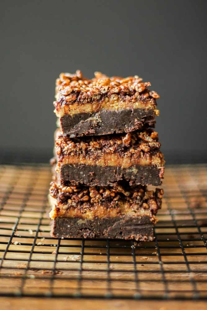 Démosle las gracias a estas barras de caramelo crujiente de triple capa (¡sin azúcar refinada y sin gluten!). La capa inferior está llena de rico chocolate en abundancia, endulzado naturalmente sin azúcar refinada y cocinado a la perfección. La segunda capa es un “caramelo” paleo hecho con algunos ingredientes increíbles (¡sigue leyendo para descubrirlo!) y la capa superior es una capa de chocolate crujiente hecha con bolas de arroz.