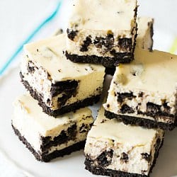 Estas barras de cheesecake tienen una corteza espesa y saludable, que me encanta. No hay nada peor que la tarta de queso o las barras de tarta de queso que se encuentran en una corteza delgada, húmeda y delgada. Grueso y duro es el único camino a seguir y esta corteza encaja perfectamente. Encima hay un pastel de queso suave y cremoso que está completamente lleno de galletas Oreo picadas. Una de las cosas que me encantan de las barras de cheesecake es que no me siento culpable por comer dos como cuando como dos pedazos de cheesecake (¡lo cual no me detuvo!).