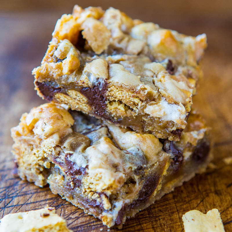 No se necesitan fogatas para estas barras suaves, pegajosas y ricas cargadas de textura y sabor. La combinación de chocolate, galletas saladas y malvaviscos, todo suspendido en una masa mantecosa a base de azúcar moreno, es simplemente mágica. Están listos de principio a fin en 30 minutos y son tan buenos, rápidos y fáciles que es posible que nunca vuelvas a tener smores regulares.