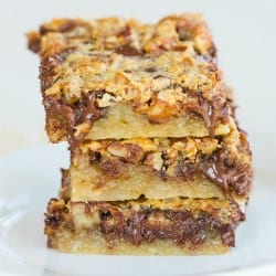 Irónicamente, nunca preparé estas barras para el Día de Acción de Gracias, pero no hace falta decir que son el postre portátil perfecto para el Día de Acción de Gracias. Son una excelente alternativa a un pastel completo, y puedes omitir fácilmente el chocolate y agregar más nueces si lo deseas. Sin embargo, creo que la combinación de chocolate y nueces es algo muy especial.